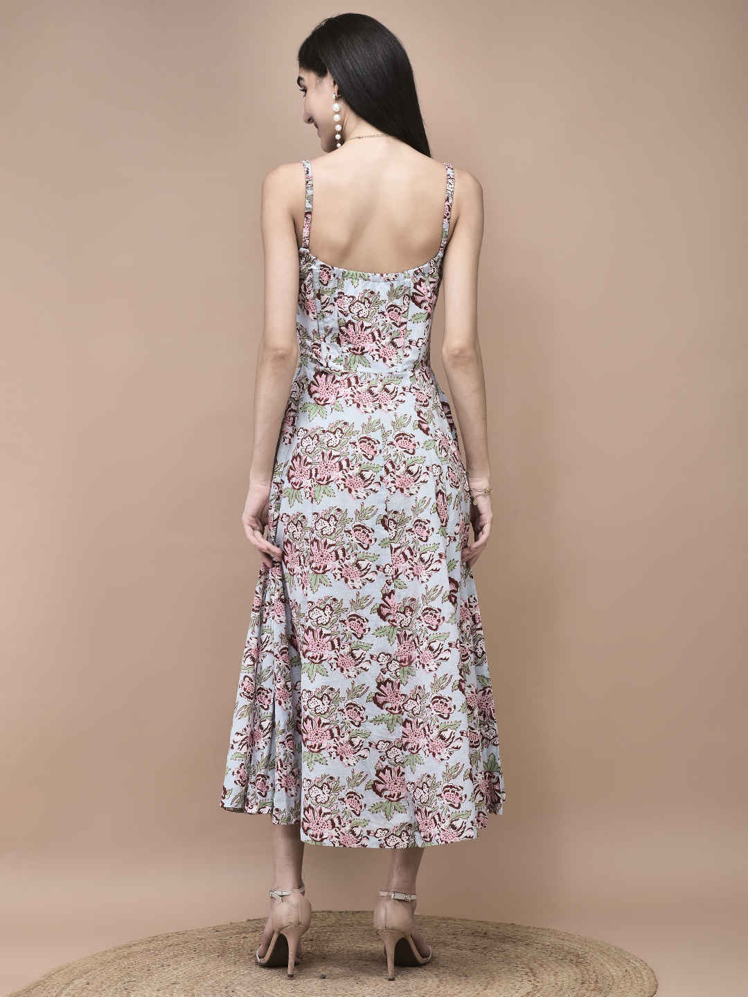 Gracefully feminine and rooted in tradition, this strappy midi dress is crafted from soft, breathable Jaipur block-printed Cambric cotton. Featuring a ruched sweetheart neckline and a flattering, flared silhouette, it combines comfort with elegance for any warm-weather occasion. The delicate hand-block floral print in soothing pastel tones lends a touch of artisanal charm, making it ideal for brunches, vacations, or casual festive gatherings. Light, airy, and effortlessly stylish — this dress brings a fresh take on timeless Indian craftsmanship.